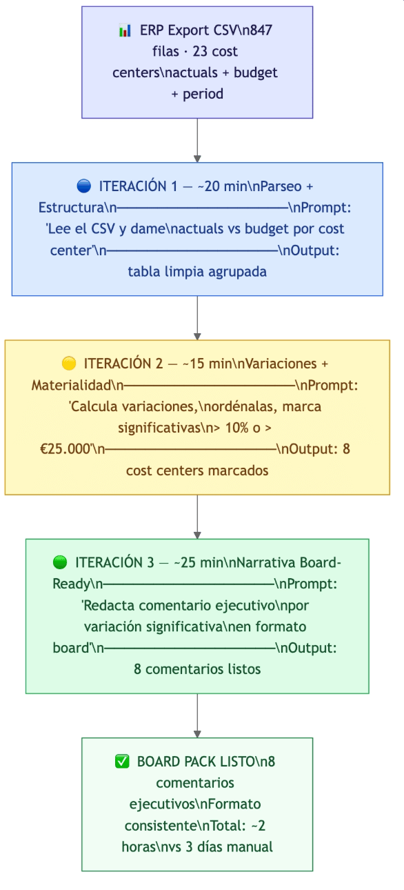 Resultado: 7 centros de coste marcados como significativos. El controller ajusta el umbral a $20.000 para capturar uno más que sabe que el CFO va a preguntar. Segunda iteración: 15 minutos.